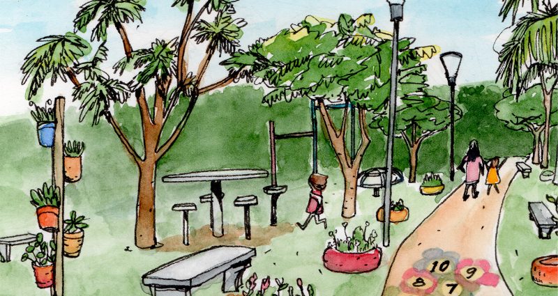Para quem procura uma amarelinha e um balanço para brincar. Com árvores frutíferas ao redor, além de bancos e mesas coloridas de onde dá para observar os pássaros bebendo água e pensar na história de mobilização coletiva que deixou a praça tão bonita.