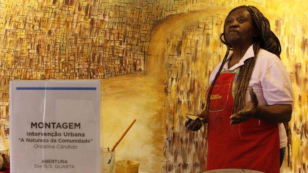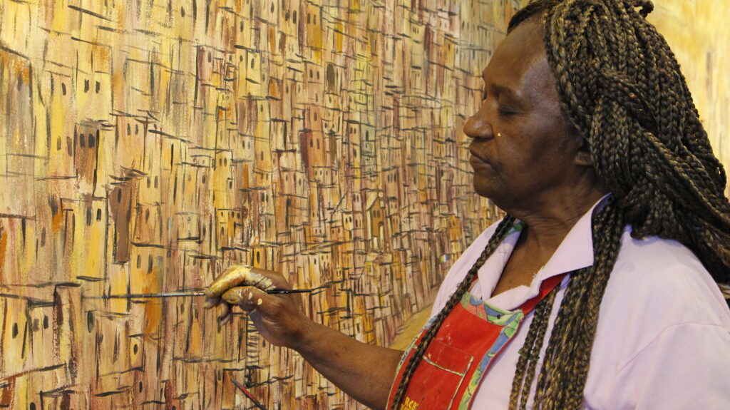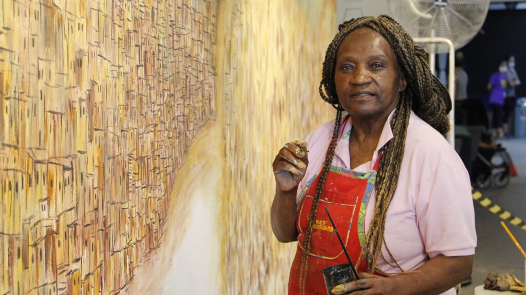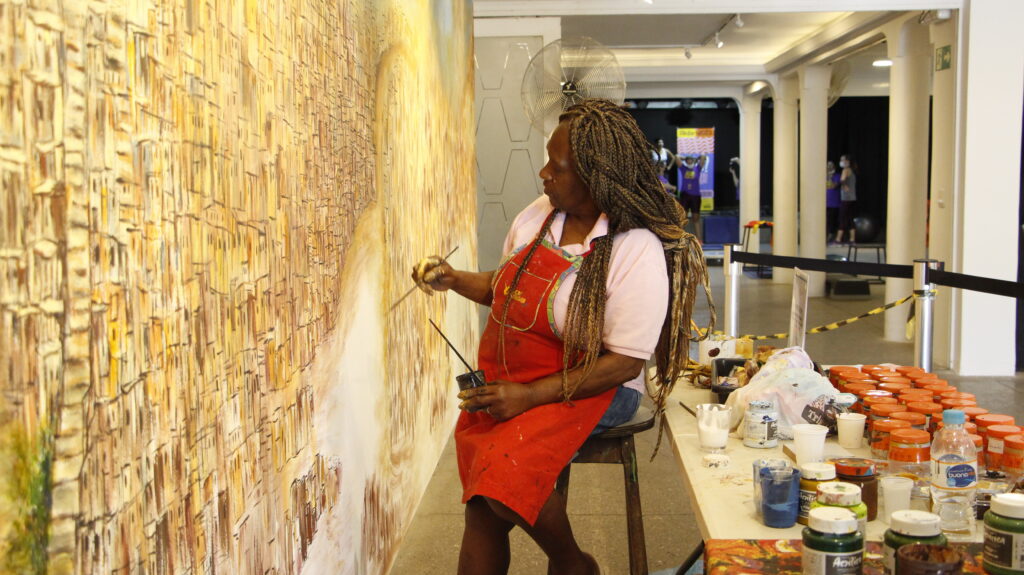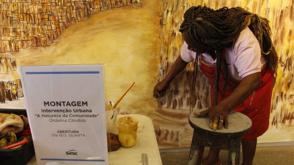 A obra realizada no Sesc São Caetano segue esta abordagem da artista, contando como pano de fundo a comunidade e revelando em impressionantes detalhes os elementos culturais e cotidianos que fazem parte deste universo: com suas rodas de capoeiras, as crianças brincando e soltando pipas, os comércios, o jogo de futebol, as mulheres com latas na cabeça e realizando atividades cotidianas, as árvores e córregos d’água.