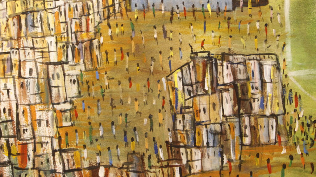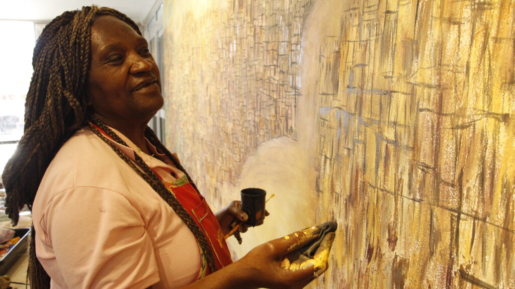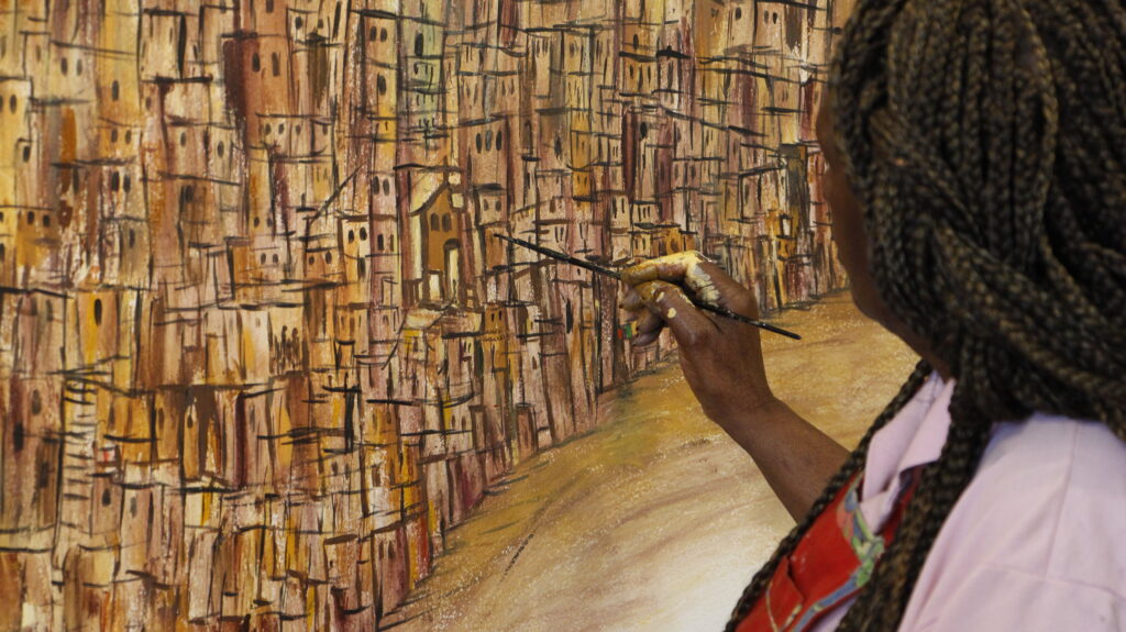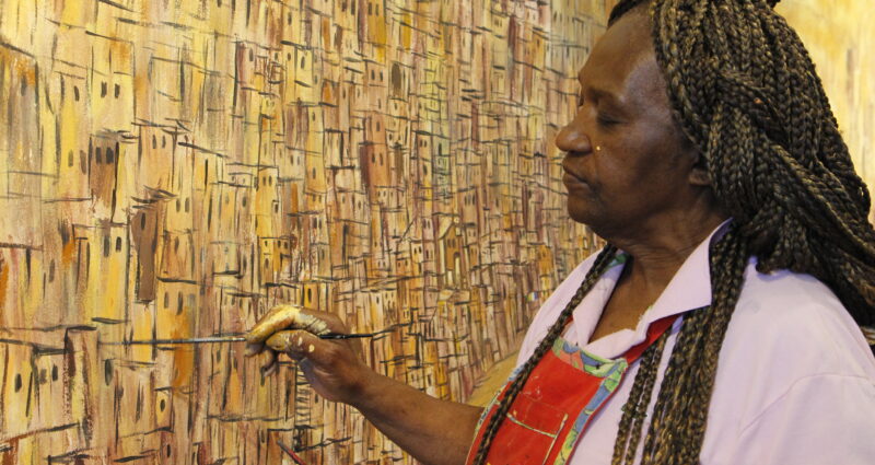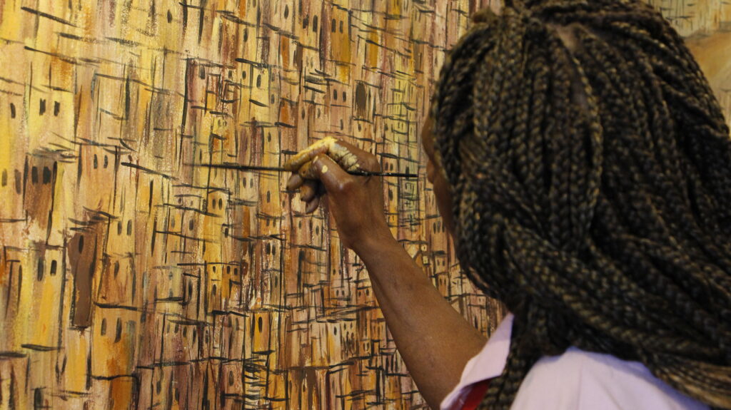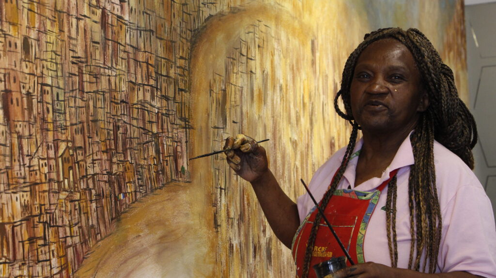 A obra realizada no Sesc São Caetano segue esta abordagem da artista, contando como pano de fundo a comunidade e revelando em impressionantes detalhes os elementos culturais e cotidianos que fazem parte deste universo: com suas rodas de capoeiras, as crianças brincando e soltando pipas, os comércios, o jogo de futebol, as mulheres com latas na cabeça e realizando atividades cotidianas, as árvores e córregos d’água.