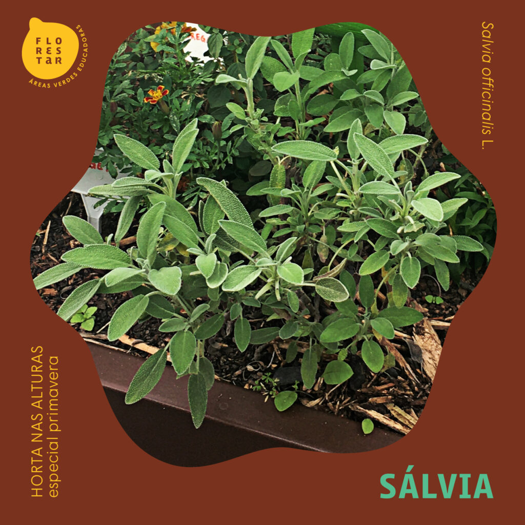 Características: A Salvia officinalis (L.), conhecida popularmente como sálvia, salva, salva-comum, salva-das-boticas, salva-ordinária, salva-dos-jardins, salva-mansa ou erva-santa, é uma planta originária da região mediterrânica oriental pertencente à família Lamiaceae ou Labiatae. É cultivada em vários países, medindo entre 20 e 80 cm de altura. É encontrada geralmente em áreas de clima temperado, onde há luz solar abundante, e se desenvolve bem em solos drenados e argilo-arenosos. Sua propagação é realizada por sementes. Apresenta folhas alongadas, de coloração entre o verde-claro e o acinzentado, textura levemente rugosa e bastante aromática, com flores melíferas de coloração entre branco e violeta, muito procuradas pelas abelhas.