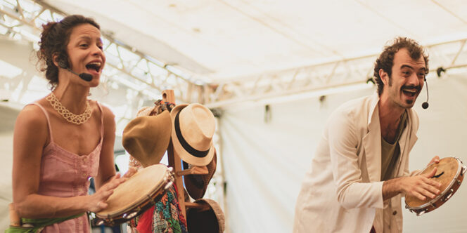 Pra cego ver: Foto horizontal colorida. Espetáculo Um Dia, Um Rio, no Sesc Ipiranga. A foto mostra um grupo de 5 pessoas usando roupas largas em tons de azul, verde e marrom e entre eles caixas de madeira. Da esquerda para a direita, um homem negro de cabelos escuros com tranças compridas toca um tambor. Uma mulher negra de cabelos escuros, crespos e curtos dança sorrindo. Uma mulher branca de cabelos escuros, lisos e presos, dança sorrindo. Atrás dela há uma outra pessoa e ao seu lado um homem branco de cabelos escuros cacheados, bigode de cavanhaque toca um chocalho. No chão há um tecido marrom que lembra terra. Foto: PriFiotti