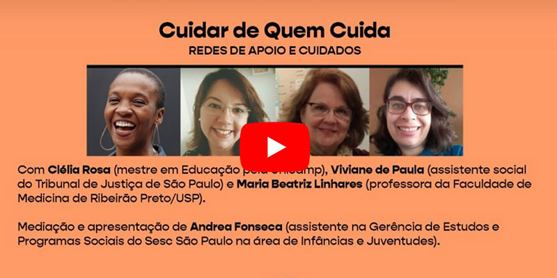 Com a participação de: Clélia Rosa, pedagoga, mestre em Educação pela Universidade Estadual de Campinas (UNICAMP), atua nos temas de educação infantil, educação e diversidade cultural, culturas infantis, formação de professores/as e metodologias de promoção da igualdade racial; Maria Beatriz Linhares, psicóloga e professora do Departamento de Neurociências e Ciências do Comportamento da Faculdade de Medicina de Ribeirão Preto, Universidade de São Paulo, coordenadora do LAPREDES – Laboratório de Pesquisa em Prevenção de Problemas de Desenvolvimento e Comportamento da Criança e membro do Comitê Científico do NCPI – Núcleo de Ciência pela Infância e do IVEPESP – Instituto para Valorização da Educação e da Pesquisa no Estado de São Paulo; e Viviane de Paula, assistente social em Varas da Família e Vara da Infância e Juventude do TJSP, mestre e doutoranda em Serviço Social pela PUC-SP, professora dos cursos de graduação e pós-graduação do Centro Universitário Assunção – UNIFAI, militante pela afirmação dos direitos da criança e do adolescente. Mediação e apresentação de Andrea Fonseca, assistente da Gerência de Estudos e Programas Sociais do Sesc São Paulo, no núcleo de Infâncias e Juventudes.