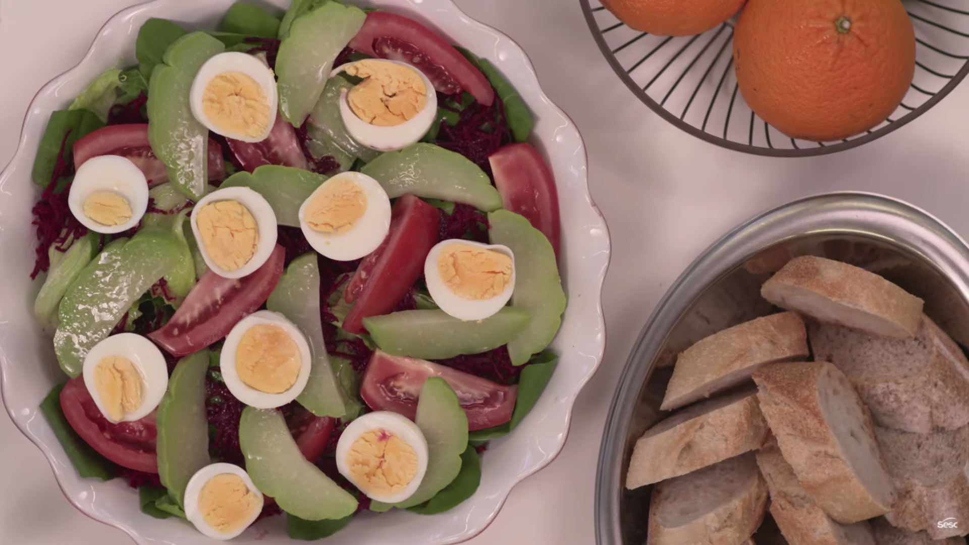 Na série Alimentação #EmcasacomSesc, profissionais da área de Alimentação do Sesc trazem dicas sobre alimentação saudável e receitas para todo mundo repetir em casa. Neste episódio, aprendemos a importância de colocar frutas, verduras e legumes no prato e também acompanhamos a montagem de uma salada de folhas, legumes e ovos!