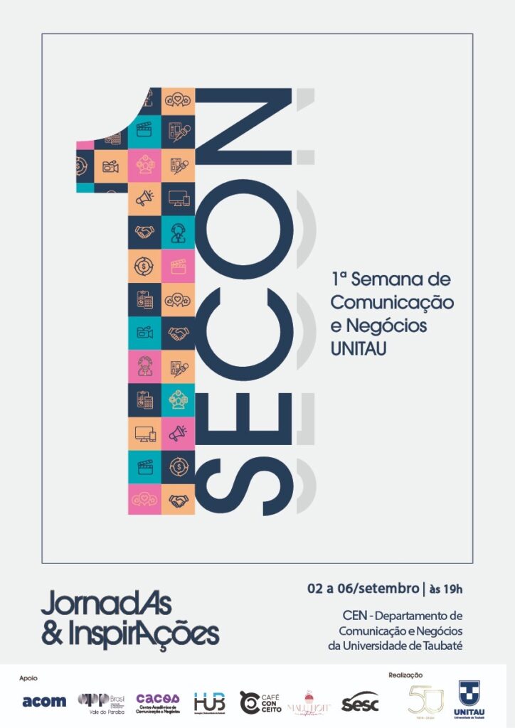 O Departamento de Comunicação e Negócios da Universidade de Taubaté será a sede da 1ª Semana de Comunicação e Negócios (SECON), com o tema “Jornadas e Inspirações”. O evento acontecerá de 02 a 06 de setembro de 2024 e contará com uma programação muito especial no período noturno, sempre a partir das 19h.