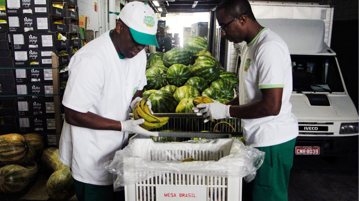 Os alimentos a serem selecionados pelos ajudantes do Mesa estão próximos a uma das docas de carga e descarga, acomodados em caixotes plásticos, próprios para o transporte de vegetais. À primeira vista os alimentos, compostos por frutas e legumes, aparentam condições impróprias para o consumo. No entanto, o olho clínico de Ailton logo reconhece, com incrível familiaridade, o que ainda pode ser aproveitado. Ele mostra quais características apresentam um legume estragado, ou porque determinado tomate, apesar de amassadinho, ainda serve para preparar um delicioso molho. Enquanto explica esses detalhes, separa os vegetais aproveitáveis nos caixotes brancos do Mesa, que antes de serem preenchidos, são revestidos por um saco plástico transparente. Este saco facilitará a entrega e armazenagem dos alimentos nas instituições sociais que serão atendidas no período vespertino.