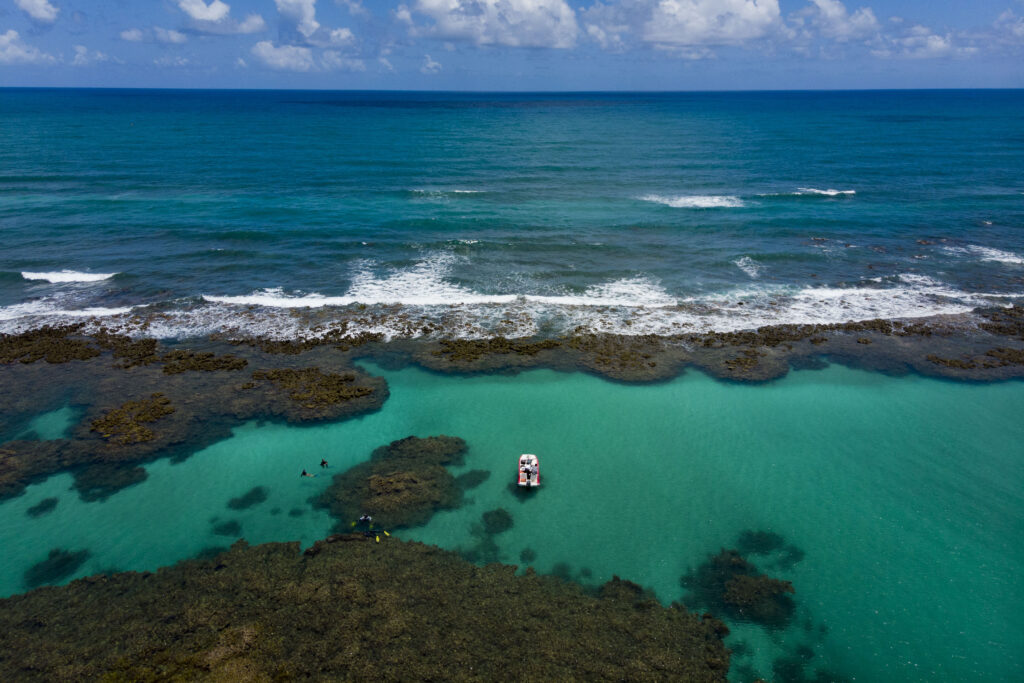 #PraCegoVer Imagem retangular e colorida do oceano, em destaque de uma área de recife com uma lancha no centro e uma mergulhadora entre os corais.