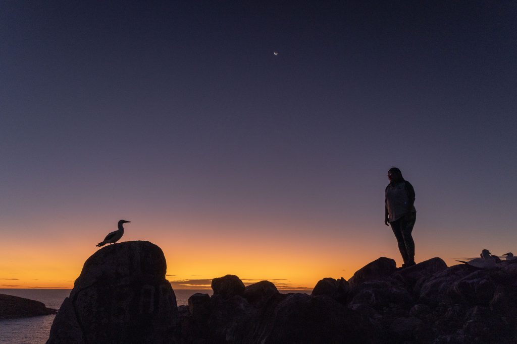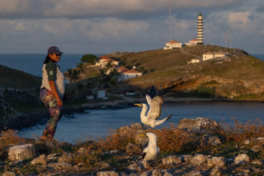 Julho também é o período de reprodução do atobá mascarado, uma espécie de ave muito amada por Berna. E foi neste mês que chegamos para conhecer de perto o trabalho de educação ambiental e de acompanhamento de estudo e pesquisa feitos nas ilhas, realizados com tanta dedicação por Berna Barbosa.