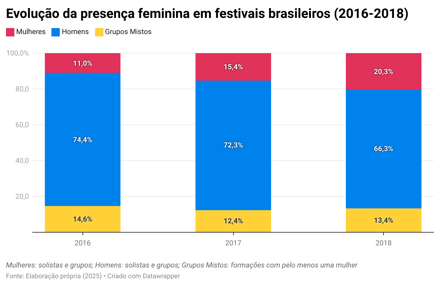 Observando de forma ampla, é possível notar que, ao longo desses três anos, a participação de mulheres (considerando solistas e bandas compostas somente por mulheres) não ultrapassa a margem de 20,3% em cada um dos anos: 11% em 2016, 15,4% em 2017 e 20,3% em 2018. Ainda que isso demonstre um crescimento, quando analisamos os festivais de forma isolada, alguns continuam em 0%.