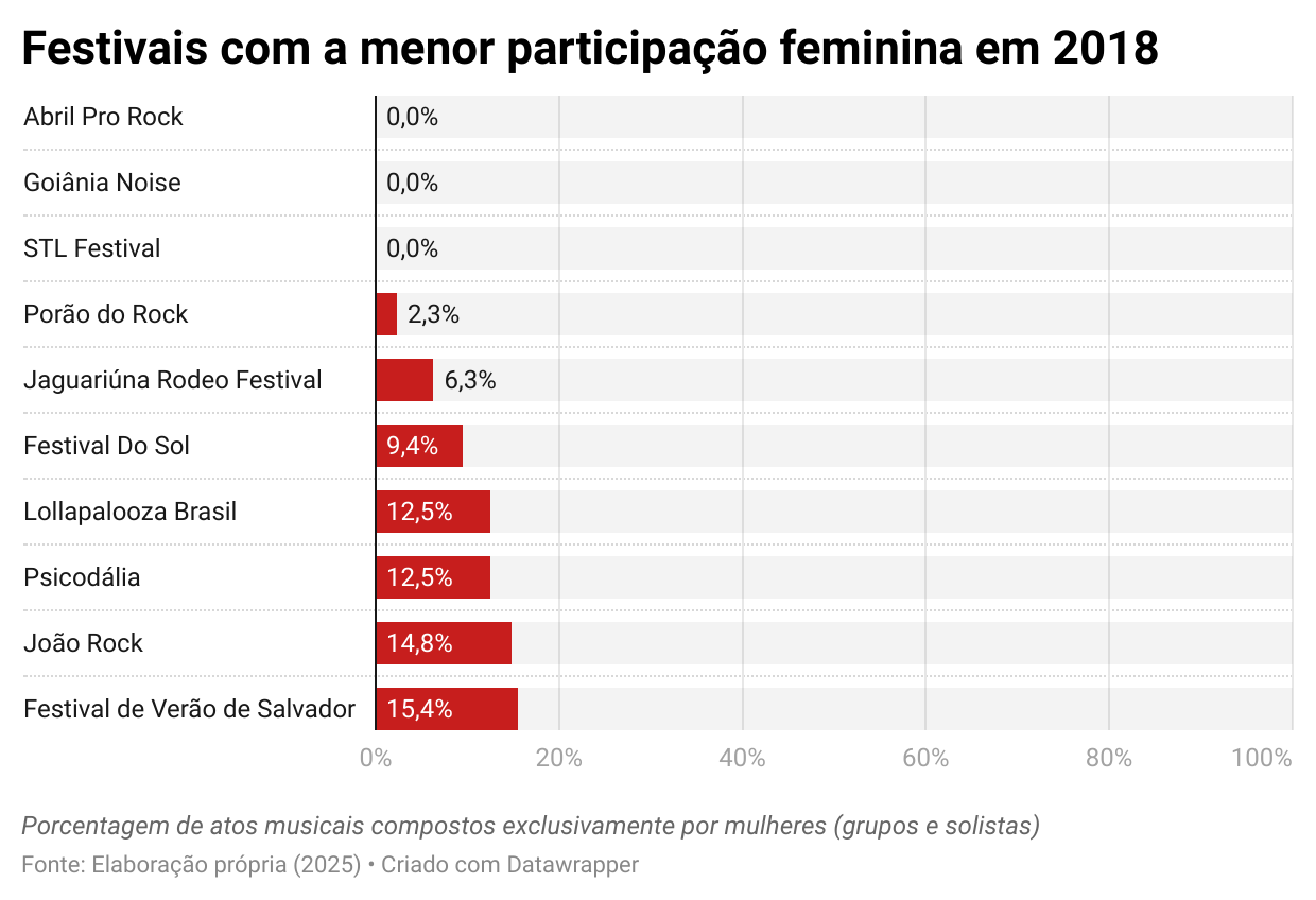 Os números mostram também que, quanto maior a tendência do festival de dar ênfase a um único gênero musical, menor é a presença feminina, chegando a ser nula. Por exemplo, em festivais mais voltados para o rock e suas vertentes.