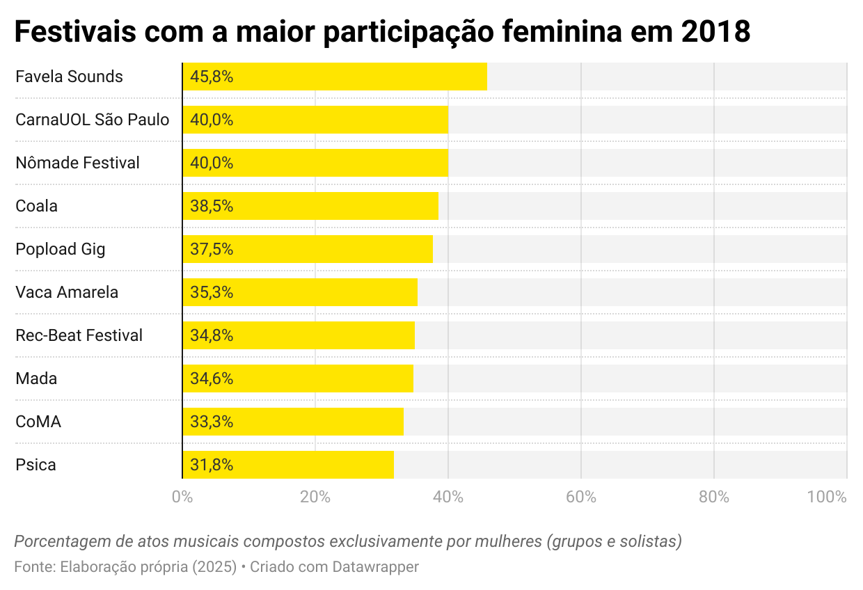 O Favela Sounds foi o festival analisado com a maior representatividade feminina. Nesse caso, vale destacar que o Favela Sounds deu ênfase a artistas negras.