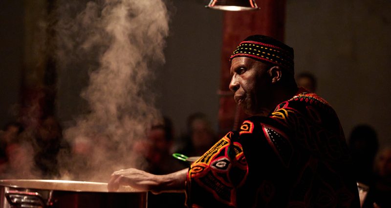 The text was shaped by historical and culinary research, discussions, and improvisations. Dance emerged quickly, because the first performer was a dancer. At first, I cooked myself, but I cannot cook for 200 or 300 people. Then we met Alexandre, who is both a chef and a former actor. I think Autophagies [Self Eaters] manages to integrate smells and flavors. Before that, I had already created a play with hairstyling. It is important for me to think of the arts differently, and cooking can be spectacular. All ceremonies and rituals involve food or drink. We eat the bread embodied in Christ, we sacrifice a lamb for Eid. The Malinke hunters, my ancestors from Mali, ask forgiveness from the animals they kill. In the play, we propose rediscovering the awareness of what eating means. To stay connected to ourselves, and to exploited humans. I did not invent this dramaturgical system, but I tried to rediscover the collective and ritual dimension of performance. In the United States, my role was played by an actress from New Orleans who knows what ceremony means, and here in Brazil, Mariela Santiago will serve as master of ceremonies. For both of them, as for me, it is not about entertainment. I truly believe in ritual, in communion. This is not a costume to be changed for another. There is a real, genuine dimension.