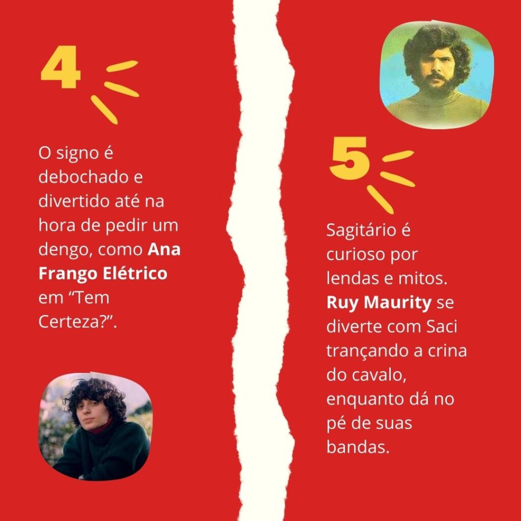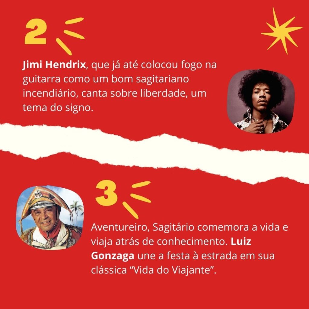 Fogo na pista! Sagitário convida o cosmos para dançar euforicamente, com o gás ilimitado que sustenta o ânimo de seguir gingando com liberdade, sempre de passagem como Jimi Hendrix, com a alma em festa ao som de Manu Dibango. O signo tem sede de conhecimento, e é na Vida do Viajante que se abastece. Estudioso de filosofias e mitos, também se diverte com Saci trançando a crina do cavalo enquanto Ruy Maurity dá no pé de suas bandas. Zé Rodrix justifica: é impossível parar de dançar! Nessa coreografia, Sagitário desliza encantado com o mundo, alegre e debochado até na hora de pedir um dengo como Ana Frango Elétrico. Expansivo como o verão, o signo do centauro tem flechas inesgotáveis, as quais são atiradas o mais distante possível, atravessando Cidades Cintilantes. De carona com Shuggie Otis, curte o trajeto em busca de seus arremessos, mas nunca chega ao destino. Como António Variações canta, Sagitário está além de tudo e, mesmo questionando a própria pressa, as fugas e as buscas insatisfeitas, segue decolando como um foguete na jornada do Zodíaco.
