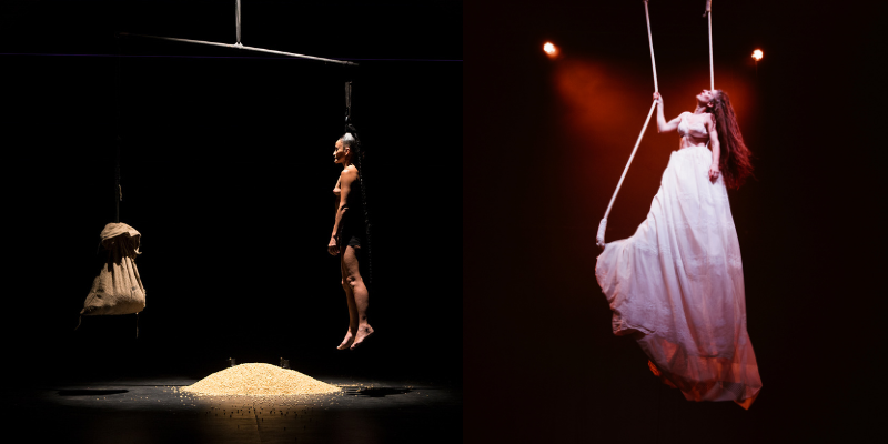Mariana Blanco suspensa pelos cabelos em sua performance Variaciones Sobre el Café (foto de Balanza) e Sofía Galliano em trapézio fixo (foto de Macarena de Noia).