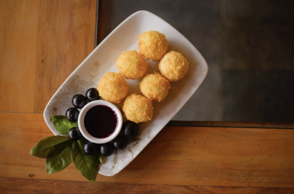 Bolinho de mandioca e queijo coalho com recheio de ora-pro-nóbis, acompanha geleia de jabuticaba. Foto: Cristiane Silva