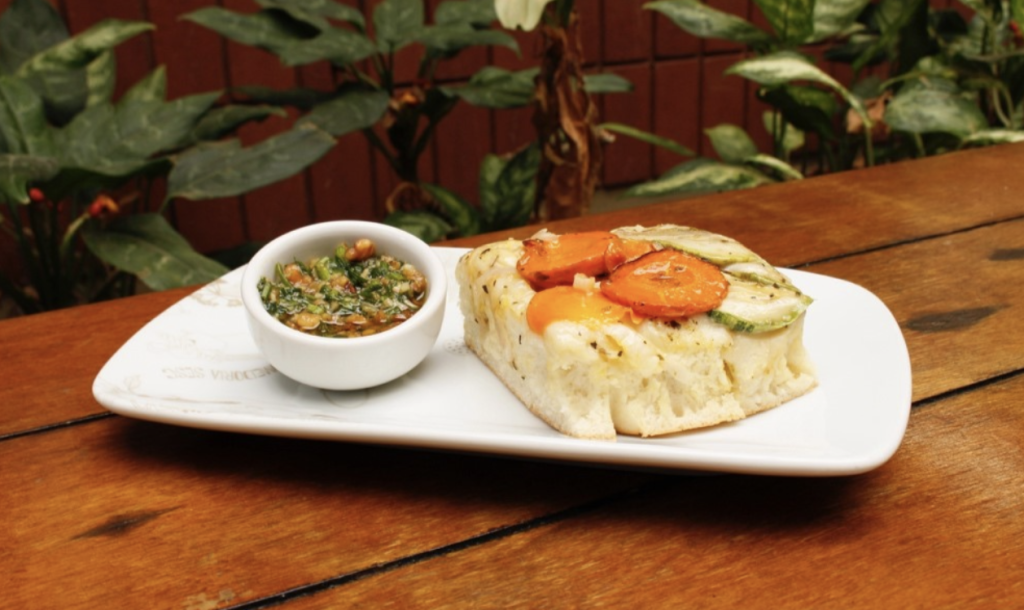 Pão artesanal com cobertura de abobrinha, cenoura, tomate e cebola-roxa. Foto: Isabela Lisboa