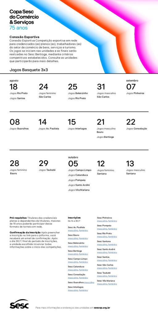 A Copa Sesc do Comércio e Serviços está prestes a começar e está comemorando seus 75 anos! Esta competição, realizada em todas as unidades do Sesc, contará com diversas modalidades esportivas, promovendo a socialização e o acesso ao lazer e incentivando a prática de atividades físicas e esportivas.