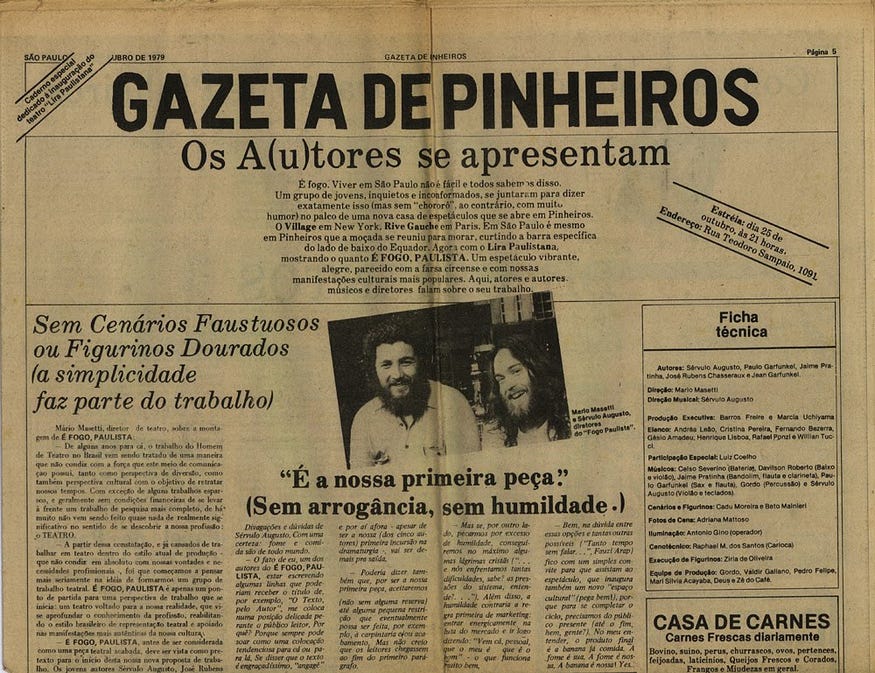 Eu encontrei com um amigo que não era músico, era administrador de empresas, mas era extremamente emocionado com a coisa musical, chamado Valdir Galiano. Ele trabalhava na Suzano Papéis, ou alguma coisa assim. Aí ele me disse “vou largar a Suzano e quero fazer alguma coisa na música. Se a gente tivesse um lugar que pudesse funcionar de estacionamento de dia e conseguíssemos colocar bandas de noite seria legal”. Aquilo ficou e começamos a procurar um lugar. Num dos anúncios tinha um espaço na Teodoro Sampaio, número 1091-A, que falava em 400 metros quadrados. Achamos estranho e fomos ver. Era um porão com pé direito extremamente generoso, de 4,20 metros e com outra vantagem, uma viela sanitária que terminava nos fundos do imóvel, na qual pudemos abrir uma porta muito grande e construir uma escada muito grande. Então você não dependia só da entrada da Teodoro Sampaio, que era super pequena. Aí começamos a reformar junto com uns amigos porque o lugar estava completamente detonado. Aí um dia andando na Teodoro pra comprar material, encontramos o pessoal da banda da Gota D’Água que tava vindo de um ensaio. Falei pra eles que tava fazendo um teatro, ou um circo, ainda não sabemos o que vai ser, mas é um espaço com uma arquibancada. E eles me disseram “pô, o Sérvulo (Augusto) tá escrevendo uma peça junto com o (José Rubens) Chachá chamada É Fogo Paulista, que é um musical”. Falei pra eles “por que vocês não vão conhecer o lugar e quem sabe a gente não monta lá?”. Na hora que eles viram eles se apaixonaram e trouxeram o diretor Mario Masetti, uma das pessoas mais incríveis que eu conheci, que topou na hora o desafio de fazer e reuniu um elenco muito importante. A peça foi um sucesso quase que imediato.