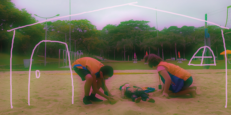 Por meio da organização de imagens registradas em momentos de livre brincar do Programa Curumim do Sesc Interlagos ao longo de 2019 e 2020, pré-pandemia foram criadas dramaturgias possíveis.
