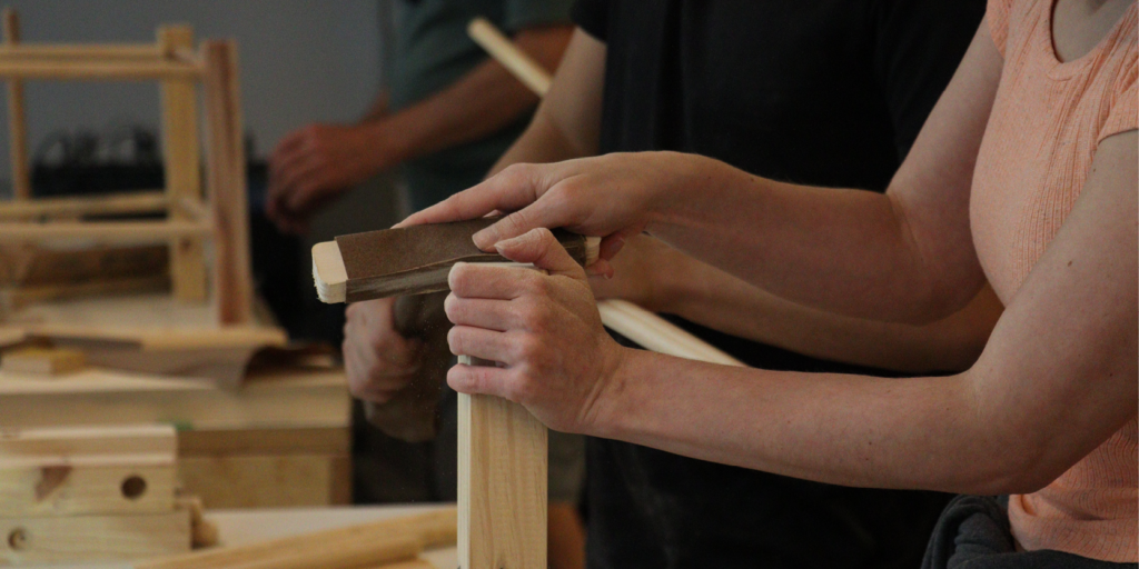 Oficina de construção de banquinho de madeira no Sesc 24 de Maio, em 2022. Foto: Helô Goes
