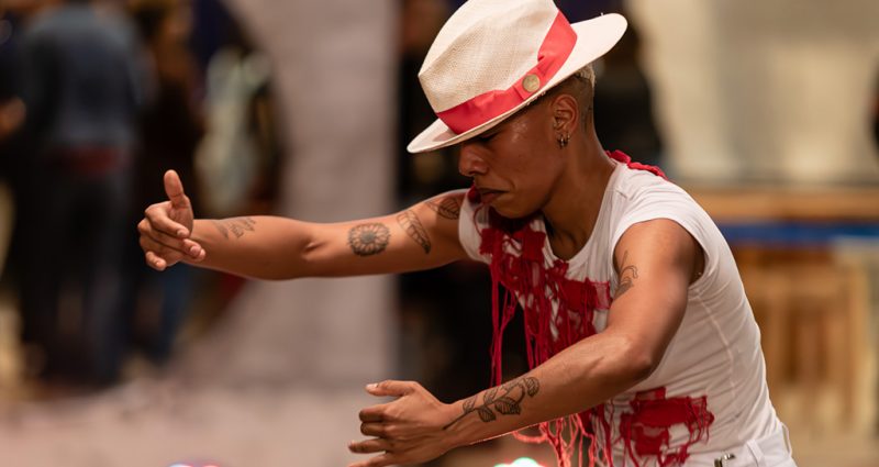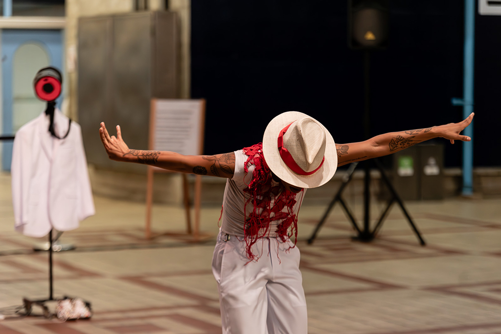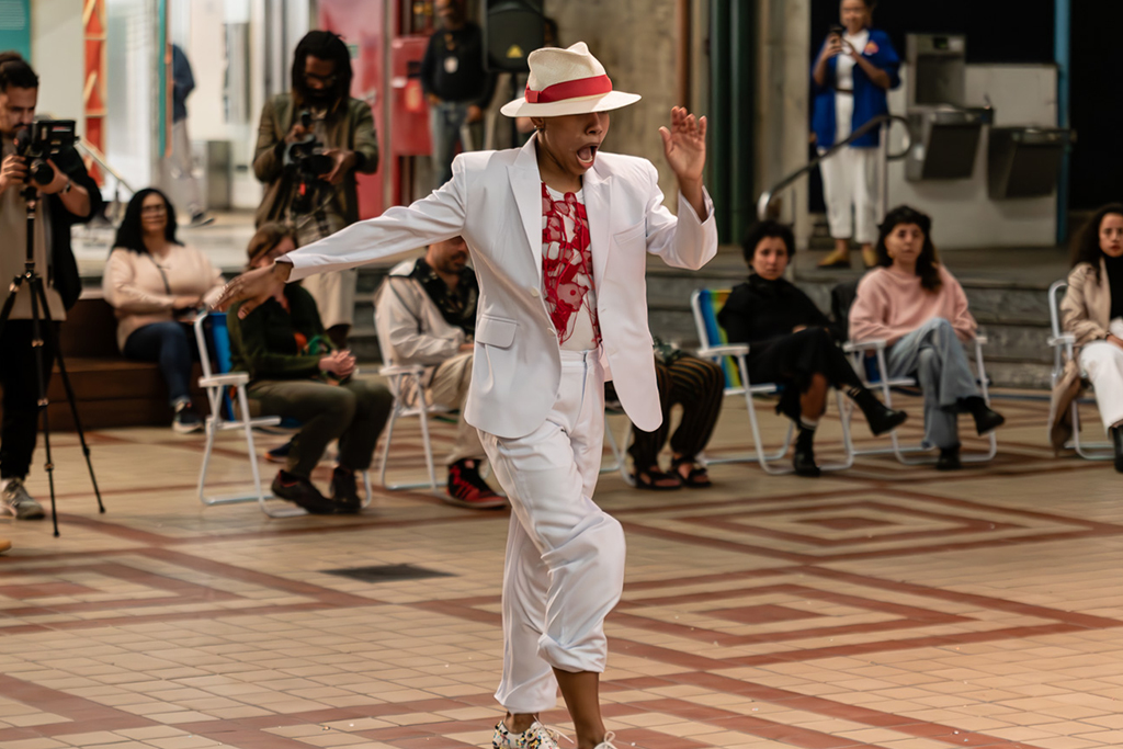 Composer and singer Geraldo Filme (1927–1995) defied time and imposed limitations. A guardian who sang of grievances and protests, he was a Black activist and an advocate for LGBTQIA+ presence in São Paulo’s neighborhoods. His work, especially Silêncio no Bexiga, inspired Malu Avelar’s performance, which draws on his legacy to analyze and delve into the presence of Black LGBTQIA+ bodies in Carnival and spaces of resistance. The artist also evokes the rogue figure of Zé Pelintra and, as a Black butch lesbian body, dances in a gesture of seeking Geraldo Filme’s blessing to continue the samba tradition. Her dance becomes a rite of passage and sensitivity, activating ways of listening that connect with ancestral and spiritual knowledge.