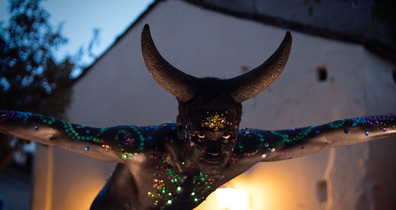 The ancestral heritage of Maranhão is the starting point for this touring performance by Leônidas Portella. Featuring Bumba Meu Boi as an apparition in the urban landscape, the show refers to the legend of the Enchanted Bull, in which a large black bull roams the dunes of Lençóis Maranhenses with a golden star on its forehead, which, when struck, awakens King Sebastian and brings prosperity to his kingdom. The performer, accompanied by musicians playing folk songs, merges the Boi and the reveler who gives life to it — called miolo, or the core — into his meticulously painted body. Created during the COVID-19 pandemic, the piece exposes the living record of a body after experiencing isolation. In doing so, it triggers a poetics about healing and opening paths, leading us to think about lives, deaths, passages, cycles, and skin changes through the prism of movement and resistance in the enchanted world of Maranhão encantaria.