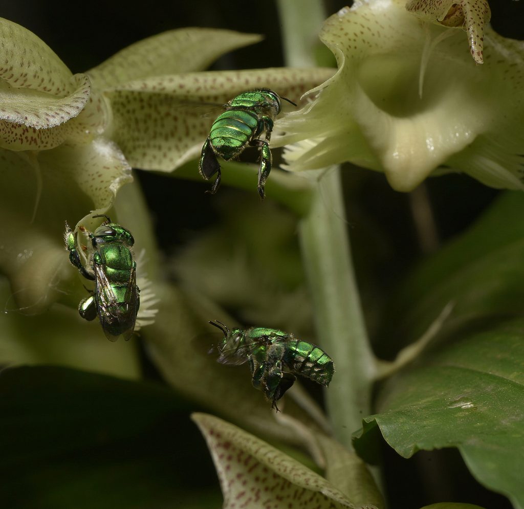De tons metálicos nas cores verde, azul e violeta, uma língua longa, maior que o corpo, olhos verdes ou escuros, com quatro asas e antenas longas, as abelhas Euglossa sp., popularmente conhecidas como abelha das orquídeas, são uma importante polinizadora de plantas silvestres e agrícolas. Vivem em ambientes naturais, especialmente em áreas com vegetação nativa com presença de orquídeas, nas quais coletam as suas fragrâncias usadas no processo reprodutivo. A espécie tem comportamento manso e não oferece risco à população. As suas colmeias podem ser encontradas em furos de galhos, ramos de árvores ou arbustos, entre raízes de orquídeas, cavidades, no solo ou em espaços entre estruturas de madeiras, sem uma entrada definida, apenas com um furo para acesso, fechado durante a noite para a proteção. A espécie não produz mel, mas faz uma mistura de pólen com concentrado de néctar para as crias. Têm, em média, de 13 a 20 milímetros. Muitas vezes, são mortas por serem confundidas com moscas varejeiras.