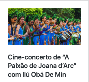 O Bloco Afro Ilú Obá De Min, um coletivo de mulheres voltado à educação, cultura e arte negra, empresta sua bateria para compor ao vivo a trilha musical do longa “A Paixão de Joana D’Arc”, em 9/12, sábado, às 19h00. Dirigida em 1928 pelo cineasta Carl Theodor Dreyer, a obra é considerada um dos títulos mais importantes do cinema mundial. A proposta é criar uma dramaturgia nova para o filme a partir do som que desafia e reavalia as estruturas narrativas hegemônicas e o jogo de identidade cultural proposto neste encontro.