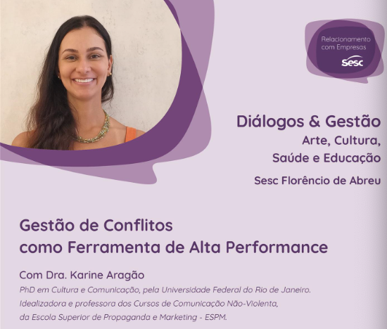 Para junho, nosso próximo encontro será realizado pelo Sesc Florêncio de Abreu e terá a palestra Gestão de Conflitos – Como ferramenta de alta perfomance, com a Dra. Karine Aragão, PHD em Cultura e Comunicação pela universidade Federal do RJ. Idealizadora e professora dos cursos de Comunicação Não Violenta da Escola Superior de Propaganda e Marketing – ESPM.