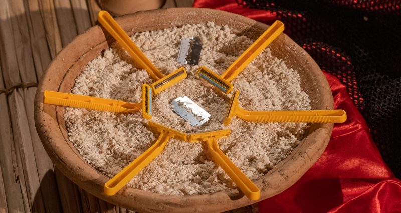 Ela faz seu ẹbọ todas as manhãs, não pula um dia. Quando a lâmina perde o corte, rasga a pele e vai sangrando. Tirar o xuxu é seu ẹbọ, seu despacho, sua performance. O Ebó de Xùxú, na verdade, não é só sobre os pelos, é sobre a disforia que eles podem causar e sobre a denúncia do estereótipo transfóbico que eles evidenciam. E, sabe a navalha que a acompanha desde os treze anos? A acompanham desde 1980.