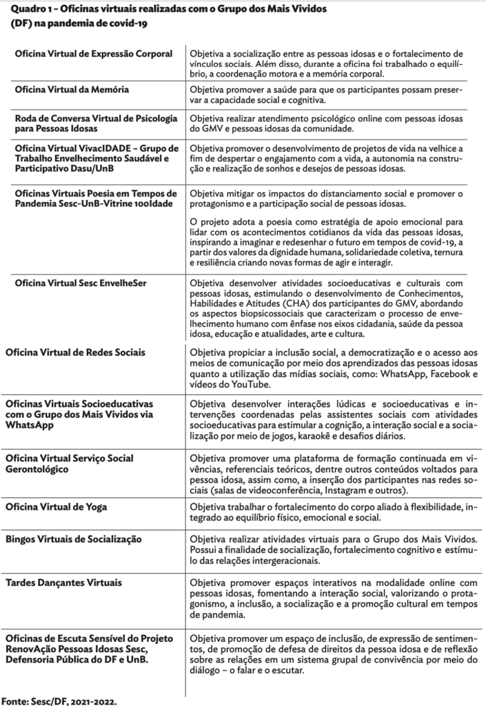 Vale ressaltar que durante a pandemia de covid-19 o Sesc/DF reformulou suas atividades, adequando-as para o formato online, sendo um dos pioneiros com essa iniciativa no Brasil. Assim, pensando no bem-estar social, principalmente dos mais vulneráveis à covid-19, o Sesc/DF, por intermédio do programa de assistência social, disponibilizou diariamente atividades de interação social por meio de grupos do WhatsApp e plataformas de mídias sociais para os participantes do Grupo do GMV visando mitigar os impactos do distanciamento social na vida de pessoas idosas no momento de pandemia mundial. Abaixo é apresentada uma síntese explicativa acerca de atividades e ações realizadas pela instituição.