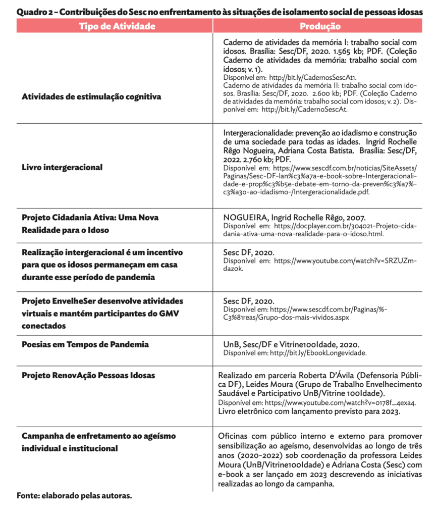Por fim, a seguir serão descritas atividades realizadas pelo Sesc/DF em parceria com a Universidade de Brasília (UnB) sob a égide do projeto de pesquisa vinculado ao Grupo de Estudos de Isolamento Social Entre Pessoas Idosas no Distrito Federal do Programa de Pós-Graduação em Desenvolvimento, Sociedade e Cooperação Internacional (PPGDS- CI). Ressalta-se que a presente pesquisa de mestrado foi fundamental para a elaboração das ações e teve a finalidade de propiciar às pessoas idosas socialização, troca de saberes, atuando na temática e promovendo ações de enfrentamento ao isolamento social entre pessoas idosas, visto que o isolamento social e o idadismo têm grave impacto sobre a saúde e a longevidade (OMS, 2022).