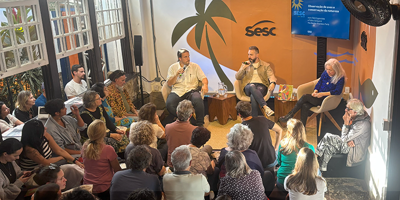 A programação das Edições Sesc começou na quinta-feira, 31 de julho, com “Observação de aves e conservação da natureza”, um encontro entre o ornitólogo Fabio Schunck, autor de Aves no Sesc Bertioga: do mar à serra, e a cantora Tetê Espíndola, que compartilhou seu olhar sensível sobre o canto dos pássaros como fonte de criação e consciência ambiental. A conversa, mediada por Gustavo Faria, lançou luz sobre a importância da escuta atenta e do encantamento com o mundo natural.