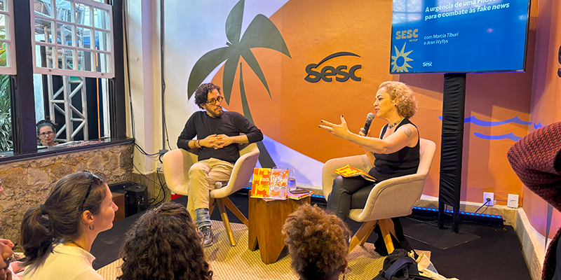 O sábado, 2 de agosto, último dia da programação do Sesc SP, trouxe novas provocações. A filósofa Marcia Tiburi e o escritor Jean Wyllys abriram o dia debatendo a falsolatria como uma das bases do discurso extremista e da desinformação. O diálogo, sob a perspectiva da filosofia pop, conectou fake news, política e responsabilidade ética.