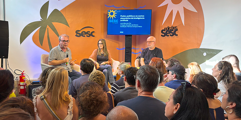 Na sequência, o jornalista Marcelo Tas e o sociólogo Sergio Amadeu da Silveira, mediados pela jornalista Patrícia Campos Mello, mergulharam nos impactos da inteligência artificial com base no livro Atlas da IA, de Kate Crawford, traduzido e publicado recentemente pelas Edições Sesc. A discussão revelou o custo ambiental, social e político das tecnologias que moldam o presente e o futuro da humanidade.
