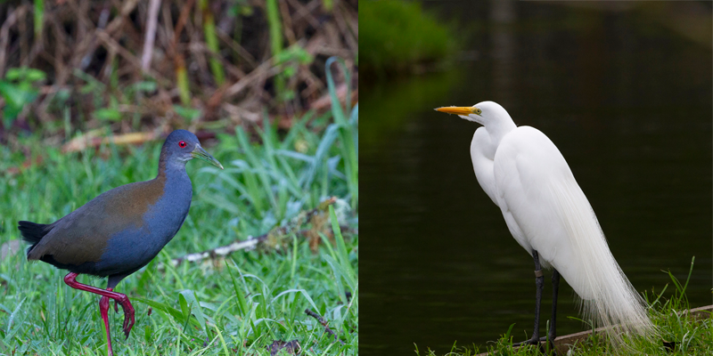 Da esquerda para a direita: Saracura do mato (Aramides saracura) | Garça Branca Grande (Ardea alba)