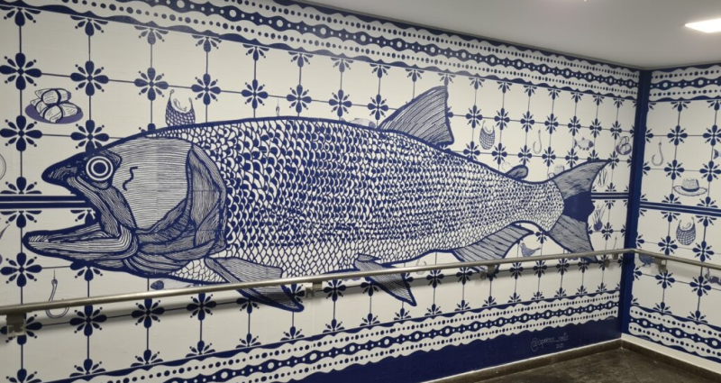 Olhando para a preservação do Rio Piracicaba e sua fauna aquática, o mural Guardião do Rio celebra a biodiversidade do rio, destacando a importância da sua conservação – com o Dourado, peixe icônico da região, como símbolo da vitalidade do ecossistema. Com a técnica de lambe-lambe, a artista Apoena (Juliana Costa) , subverte a estética em azul e branco que remete aos azulejos e à colonização portuguesa, enquanto dialoga com a temática ambiental trazida pela COP 2025, buscando conscientizar sobre a urgência de proteger nosso rio, ameaçado por poluição e degradação.