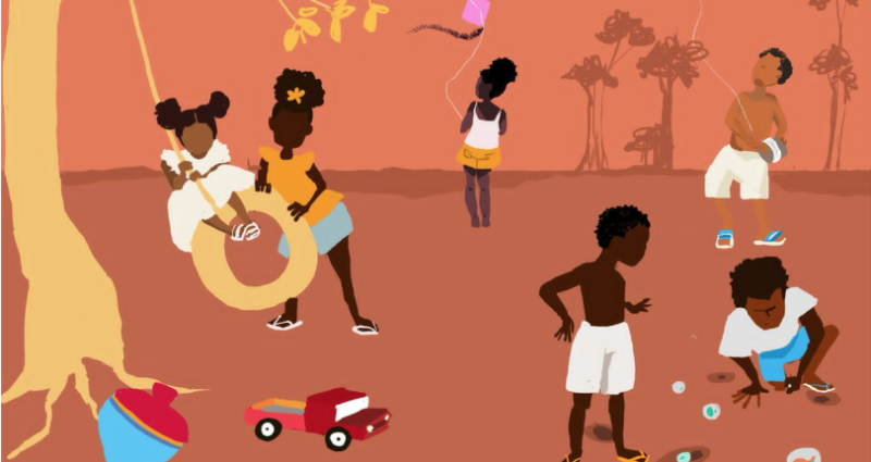 As paredes da Cafeteria se transformam em lugar destinado às artes plásticas e abrem espaço para diferentes técnicas e estilos. A cada quatro meses um(a) artista é convidado para mostrar um pouco do seu trabalho. O artista Diógenes traz para o projeto Entreparedes sua pesquisa “Afrocaipiras”, com uma ilustração que coloca em foco as crianças. Que histórias essa imagem conta? Quais narrativas você pode imaginar