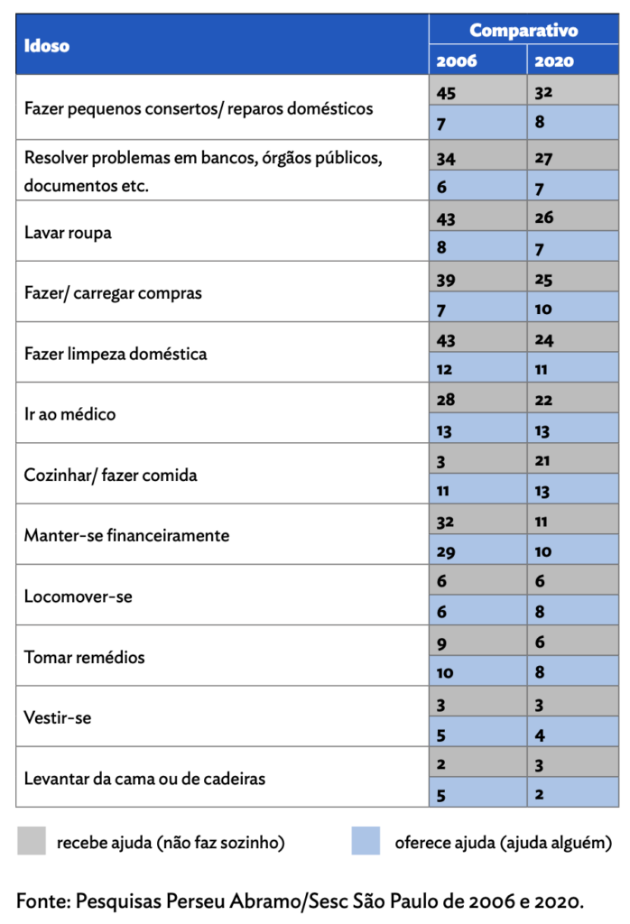 Considerando que as relações familiares são importantes nas fon- tes disponíveis de apoio e de ajuda, elas também vêm acompanhando as mudanças nos modelos de famílias e modos de viver na sociedade contemporânea. Com o aumento de idosos(as) que vivem sozinhos(as) ou apenas em casal (ninho vazio), dos estados de viuvez, da redução da quantidade de pessoas no domicílio, que varia conforme o gênero e a raça, diminuem também as fontes de ajuda e suporte com que os(as) idosos(as) podem contar. A comparação entre a pesquisa realizada em 2006 e a de 2020 denota redução geral nas fontes de atendimento de necessidades das pessoas idosas, desde as tarefas domésticas – lavar, cozinhar – a ir ao médico, tomar remédios, manter-se financeiramente, resolver problemas em bancos, documentos e em órgãos públicos, dentre outras. Em muitas dessas ajudas, a queda foi de quase 30%, con- forme demonstra o gráfico a seguir: