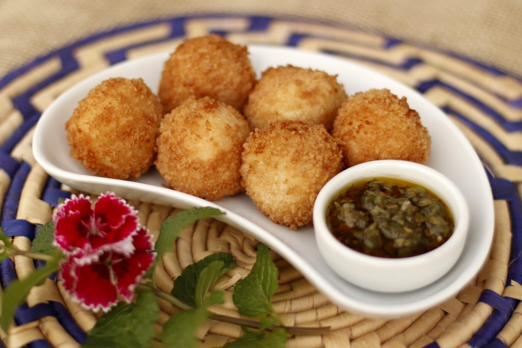 Bolinho de mandioca recheado de linguiça suína e queijo muçarela com molho de hortelã grauda e pariparoba