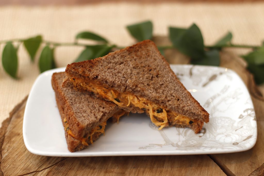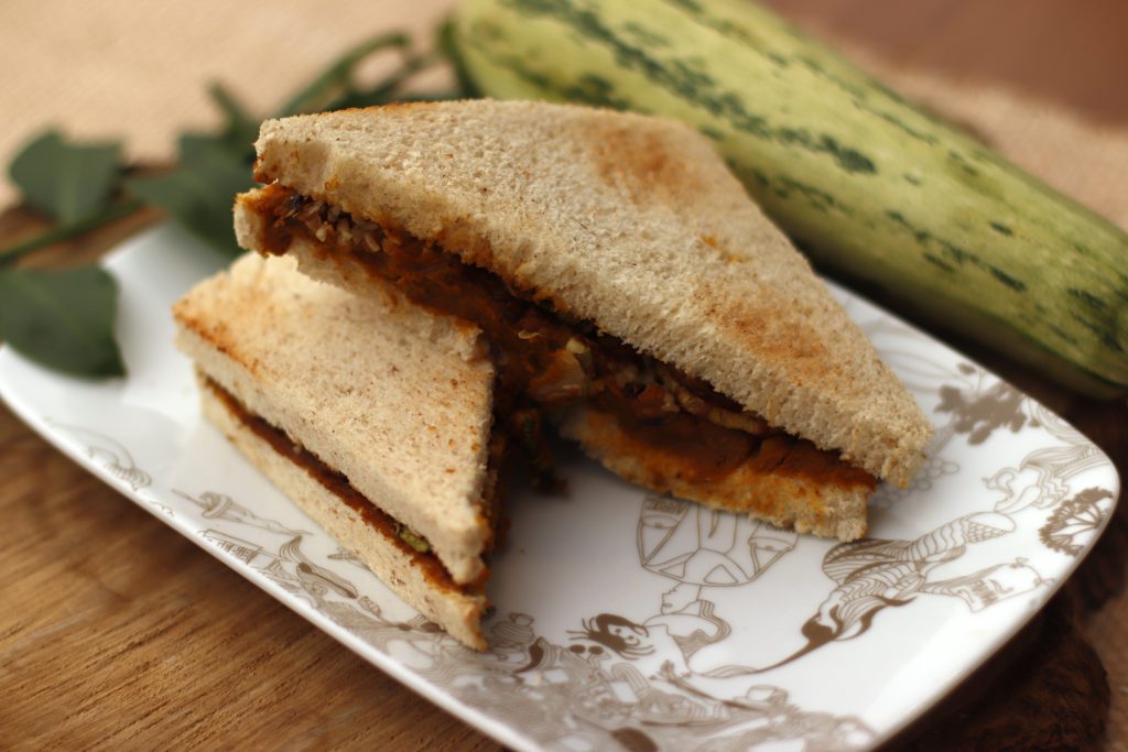 Sanduíche de abobrinha assada com pasta de abóbora, tahine e castanha-de-caju no pão de miga