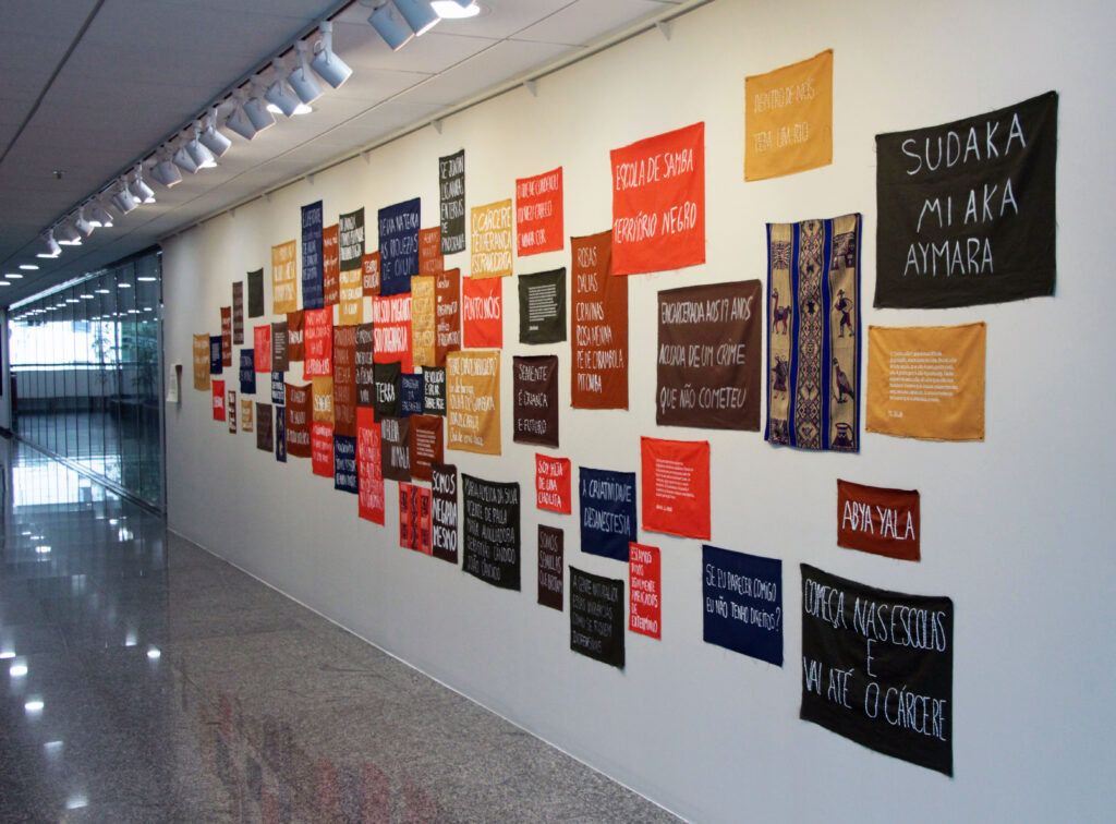 Subindo para o primeiro andar a gente encontra um mural com formas, cores, texturas e mensagens. Neste lugar, a força das palavras, das plantas e sementes, das crianças e da visão de um futuro promissor se entremeiam. Cada elemento contribui para um diálogo e uma reflexão, as flâmulas estampam juntas um painel diverso e único, que reverberam o desejo de um futuro mais justo e igualitário.