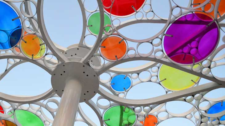 O lado externo do Sesc Santana concentra a parte lúdica e também fantástica da exposição. Lá estão um canhão caleidoscópico giratório, a instalação ‘Cinectica’, três grandes painéis de chapinhas coloridas manipuláveis e uma espécie de jardim futurista, com mesas com guarda-sóis multicoloridos articuláveis, além de flores de metal com pétalas móveis e, claro, coloridas.