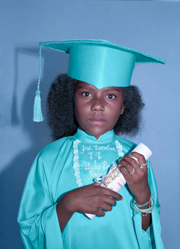 Espaço das Becas: em torno de 120 imagens, impressas em papel de algodão, de crianças e jovens da comunidade da Serra celebrando a formatura escolar. Elas estão vestidas com as tradicionais becas coloridas e com diplomas nas mãos.