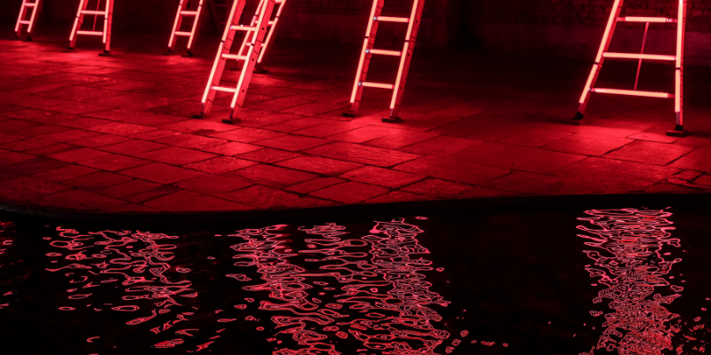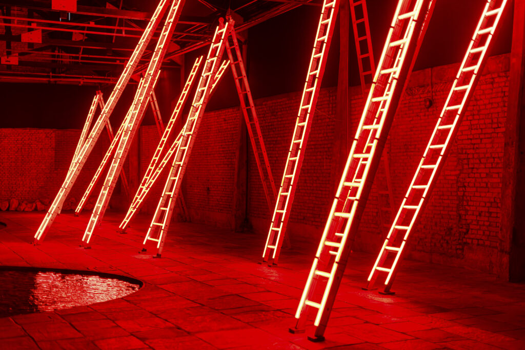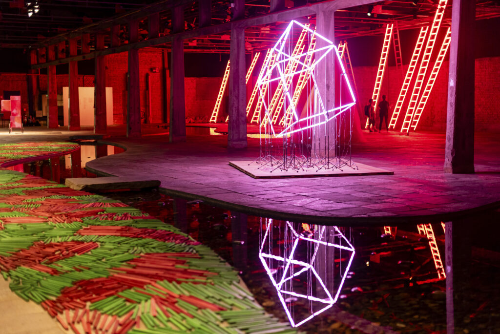 Todas as 13 obras em grande escala foram criadas como site specific, isto é, especificamente para o local, sem salas, paredes ou outras demarcações. Além disso, quatro obras (UMA CASA, O FOTÓGRAFO, ESCADAS VERMELHAS e GATO, esta a única criada para essa mostra) têm luzes de cores variadas, em referência aos famosos anúncios luminosos das cidades. “Trazem essa ideia de você ver algo de longe, a quilômetros de distância, e se sentir atraído(a)”, resume a artista.