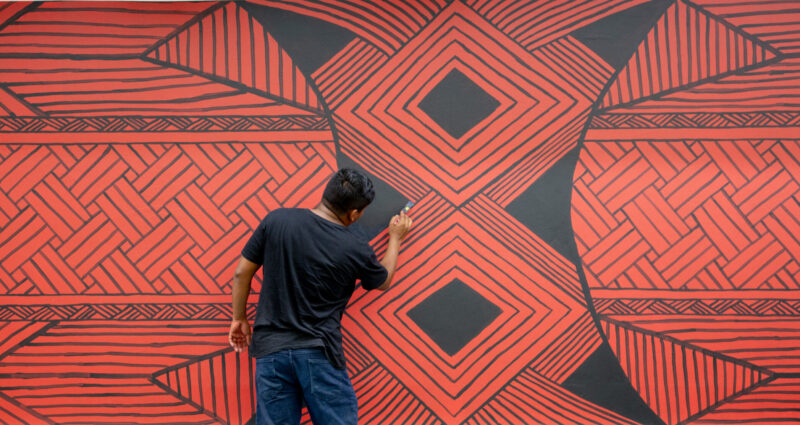Artista indígena dessano cria mural com grafismos que representam troca de conhecimento, alegria e proteção. créd. Marcello Ferreira