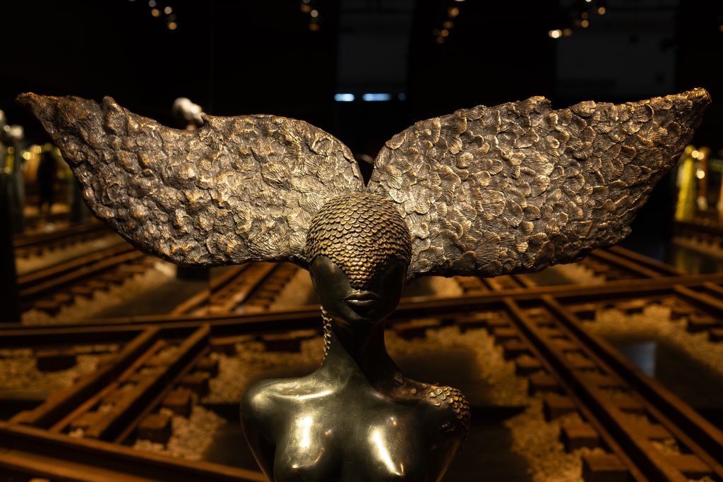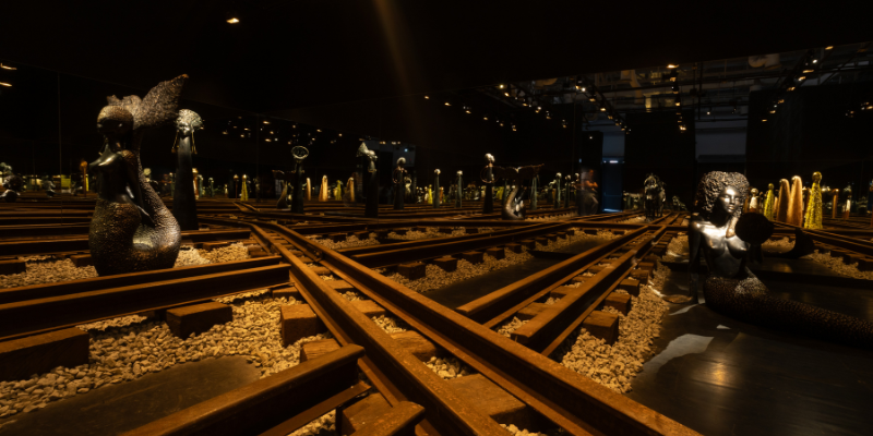 Entre trilhos infinitos que encaminham as energias de Exu Olónan (o dono dos caminhos) e de Ogum (o senhor dos caminhos), a potência feminina ancestral se apresenta com altivez e encantamento, como na série de esculturas Yabás, que representa mulheres conectadas com o sagrado, como Iemanjá e Iansã. “Elas estão de olhos fechados porque o centro é para dentro. É preciso muita concentração para saber quem você é e não se perder, não se paralisar diante do medo e continuar seguindo naqueles caminhos de ferro, quando muitos acessos e reconhecimentos são negados”, explica Nádia Taquary.