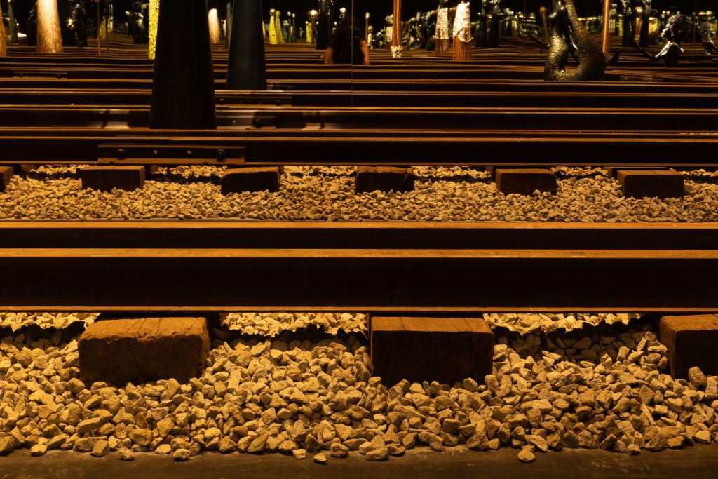 “Os trilhos não são cenográficos. A exposição acontece dentro da instalação, o que também é interessante porque não é usual ver uma artista mulher com uma instalação deste porte”, comenta Amanda. A expografia conduz o público por um ambiente onde as sensações de sonho e realidade se misturam, assim como estão embaralhadas as fronteiras do mundo físico e espiritual – o que ressalta a cosmopercepção iorubana, segundo a qual todos os universos estão conectados.