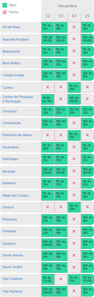 As unidades do Sesc São Paulo funcionam em horário especial no feriado da Proclamação da República (15/11). E para o feriado da Consciência Negra (20/11), as unidades funcionarão em seus respectivos horários realizados aos domingos.