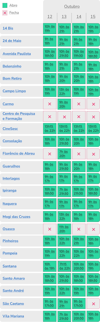 Programe-se! As unidades do Sesc São Paulo funcionam em horário especial neste feriado de 12 de outubro.