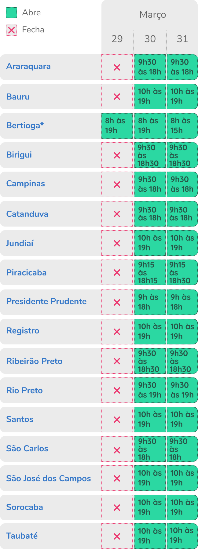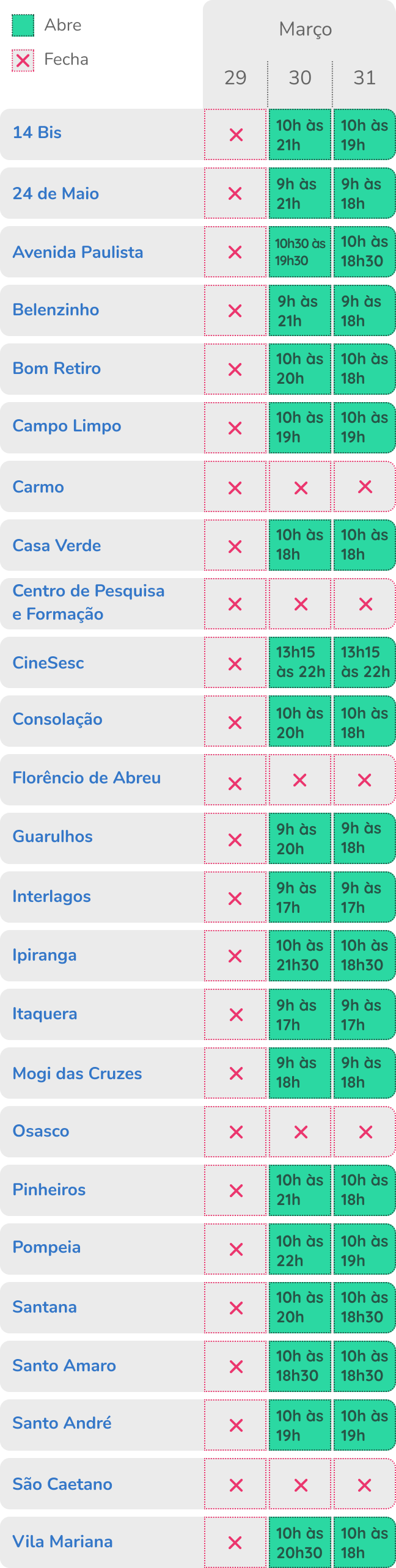 As Unidades do Sesc São Paulo estarão fechadas no feriado da sexta-feira, 29 de março, exceto o Sesc Bertioga. Confira abaixo os horários de funcionamento das Unidades que abrem no sábado e domingo, 30 e 31 de março.